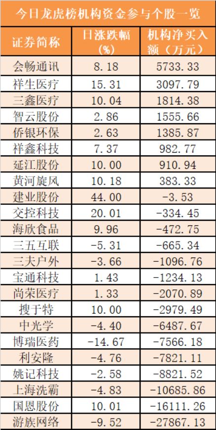 盘后龙虎榜数据显示,机构现身23股,其中会畅通讯等8股呈现机构资金净买入,游族网络等15股呈现机构资金净卖出。