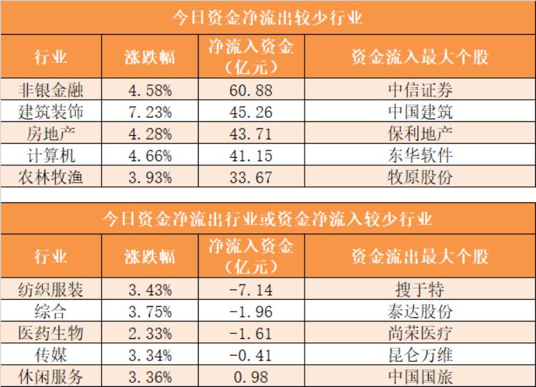 28个申万一级行业中,24个行业实现资金净流入,其中非银金融行业净流入60.88亿元居首。