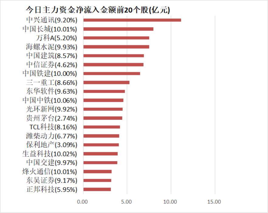 中兴通讯主力资金净流入11.14亿元居首