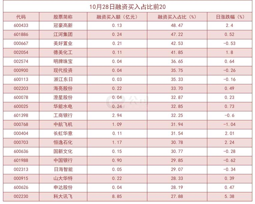 个股方面,沪深两市共有1827只个股有融资资金买入。从融资买入额占当日总成交金额比重来看,共有107只股票融资买入额占比超20%,其中冠豪高新(48.47%)、江河集团(47.22%)、美好置业(42.53%)排名前三。