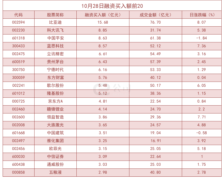 从融资资金买入金额来看,共有107只个股买入金额超亿元,其中比亚迪(15.68亿元)、科大讯飞(8.85亿元)、中国平安(8.63亿元)居前三位。