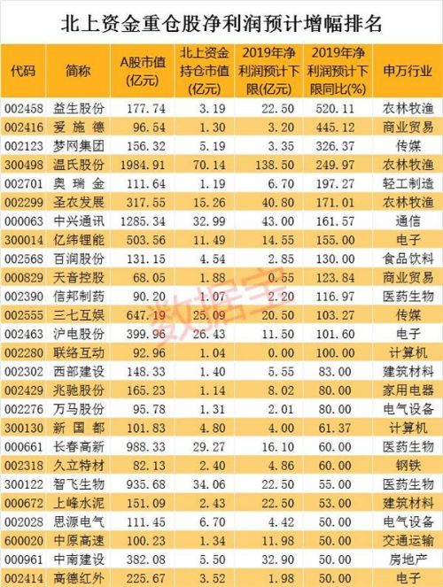 在净利润预计翻倍股中,2只市值千亿级行业龙头在列,分别是猪肉股龙头温氏股份和5G通信龙头中兴通讯。温氏股份预计净利润为138.5亿元至143亿元,同比增长2.5倍至2.61倍;中兴通讯预计净利润为43亿元至53亿元,同比增长1.62倍至1.76倍。此外,净利润预计翻倍股中,有6股获北上资金持仓超过10亿元,分别是温氏股份、中兴通讯、沪电股份、三七互娱、圣农发展、亿纬锂能。