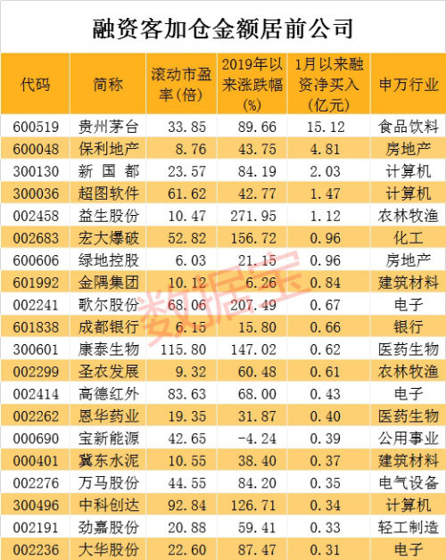 与北上资金一样,融资客在过去一年频繁出手,开年之后节奏不停。开年以来融资客累计净买入已达到246.64亿元。上述61股中,部分股票获得融资客大手笔加仓。数据宝统计显示,在短短6个交易日内,5股获融资客净买入超亿元,分别是贵州茅台、保利地产、新国都、超图软件、益生股份。白酒行业龙头贵州茅台获融资客净买入额最高,为15.12亿元。