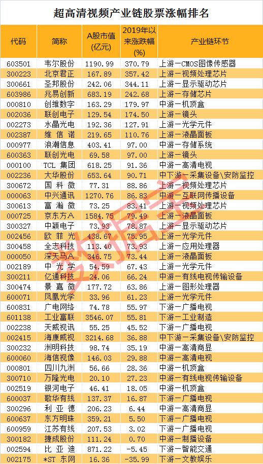 韦尔股份累计涨幅370.79%排名第一位,公司位于超高清视频产业链的上游,是国内CIS龙头,产品包括CMOS高清摄像头。同样处于产业链上游的北京君正、圣邦股份、兆易创新累计涨幅均在2倍以上,分别涉及视频处理芯片、显示驱动芯片、存储芯片等。