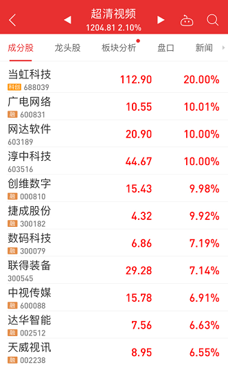 距离超高清视频产业标准的出台时间越来越近,A股市场小伙伴已蠢蠢欲动。证券时报·数据宝统计显示,超高清视频指数今日大涨2.85%,5只概念股涨停,分别是广电网络、淳中科技、佳创视讯、创维数字、捷成股份。