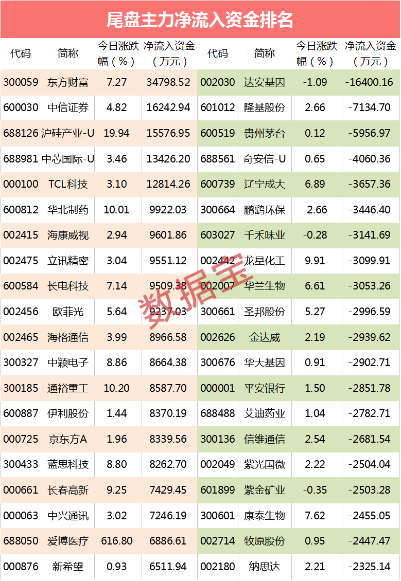 个股方面,尾盘5只个股流入资金超亿元。东方财富、中信证券两只券商股分别流入3.48亿元和1.62亿元。沪硅产业、中芯国际、TCL科技三只科技入流入资金超亿元。