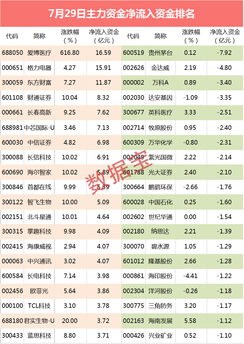 资金流出超亿元个股有25只。贵州茅台资金流出7.92亿元居首,公司昨日发布半年报,净利润226亿元,同比增长13%。公司股价高开低走,收盘微涨0.12%。长寿药概念龙头金达威资金流出4.8亿元,万科A、达安基因分别流出超3亿元。
