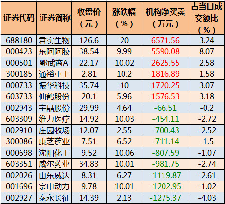 盘后龙虎榜数据显示,机构席位资金净买入1.26亿元,其中,净买入的个股6只,净卖出的个股9只。机构净买入最多的股票是君实生物,净买入金额为6571.56万元;机构净卖出最多的股票是泰永长征,净卖出金额为1275.37万元。