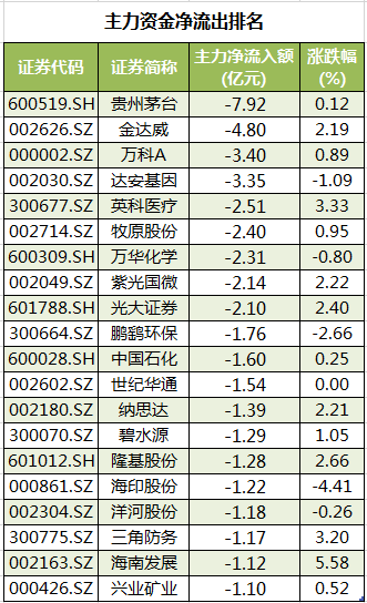 此外,25股被主力资金净卖出超亿元。其中,贵州茅台、金达威、万科A、达安基因、英科医疗主力资金净流出较多,净流出金额分别为7.92亿元、4.8亿元、3.4亿元、3.35亿元、2.51亿元。