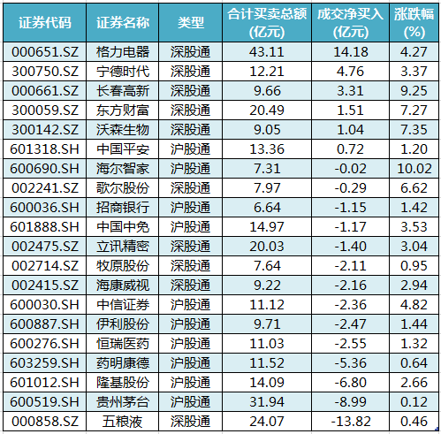 个股方面,格力电器、宁德时代、长春高新、东方财富、沃森生物北向资金净买入金额居前,净买入金额分别为14.18亿元、4.76亿元、3.31亿元、1.51亿元、1.04亿元;五粮液、贵州茅台、隆基股份、药明康德、恒瑞医药北向资金净卖出较多,净卖出金额分别为13.82亿元、8.99亿元、6.8亿元、5.36亿元、2.55亿元。