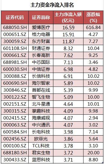 具体到个股来看,96股主力资金净流入超亿元。其中,爱博医疗、格力电器、东方财富、财通证券、长春高新主力资金净流入居前,净流入金额分别为16.59亿元、15.91亿元、11.87亿元、8.32亿元、7.62亿元。