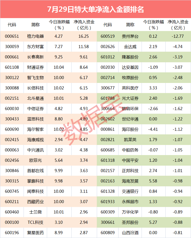 个股来看,两市有12只股票获特大单净流入超4亿元。格力电器特大单资金净流入居首,为16.25亿元。紧随其后是东方财富,特大单资金净流入为11.58亿元。7月28日,中信证券发布临时股东大会取消议案并增加临时提案及延期召开的公告。同日,中信建投发布了新修订的公司章程,其中多项内容与中信证券拟新增内容高度相似。受此消息影响,沉寂多日的券商板块今日再度走强,财通证券涨停,西南证券、中信建投等多只个股大涨。长春高新特大单资金净流入排名第三,为9.61亿元。