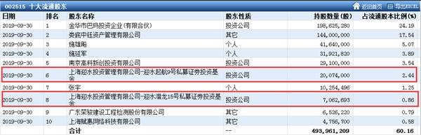 记者注意到,10月21日晚间,金字火腿发布了2019年三季报。报告显示,公司前三季度共实现营业收入1.68亿元,同比下降48.41%;实现净利润4750.14万元,同比增长316.38%;扣非净利润4353.72万元,同比增长4003.86%。同时,在公司公布的三季报中,公司股东名单中也出现了私募基金的身影,其中上海迎水投资旗下有两只产品携手入驻,迎水起航9号私募证券投资基金期末持有2007.4万股,迎水潜龙15号私募证券投资基金期末持有706.27万股。此外,同样是上海迎水投资旗下的迎水通怡1号私募证券投资基金三季度增持新宁物流88.14万股,期末持有595.16万股。