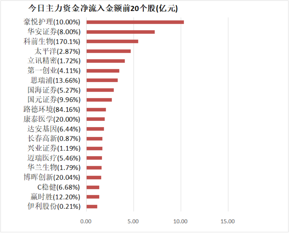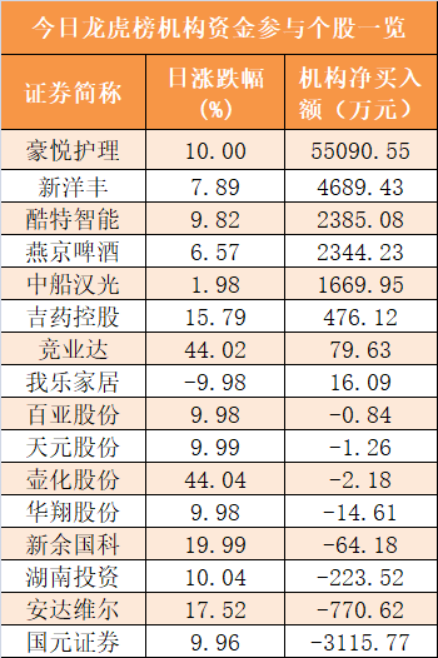盘后龙虎榜数据显示,机构现身16股,其中豪悦护理等8股呈现机构资金净买入,国元证券等8股呈现机构资金净卖出。