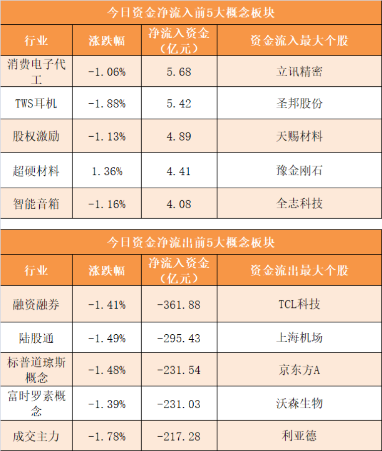 概念板块方面,今日消费电子代工、TWS耳机、股权激励、超硬材料等概念板块资金呈现净流入,其中消费电子代工概念净流入5.68亿元居首。