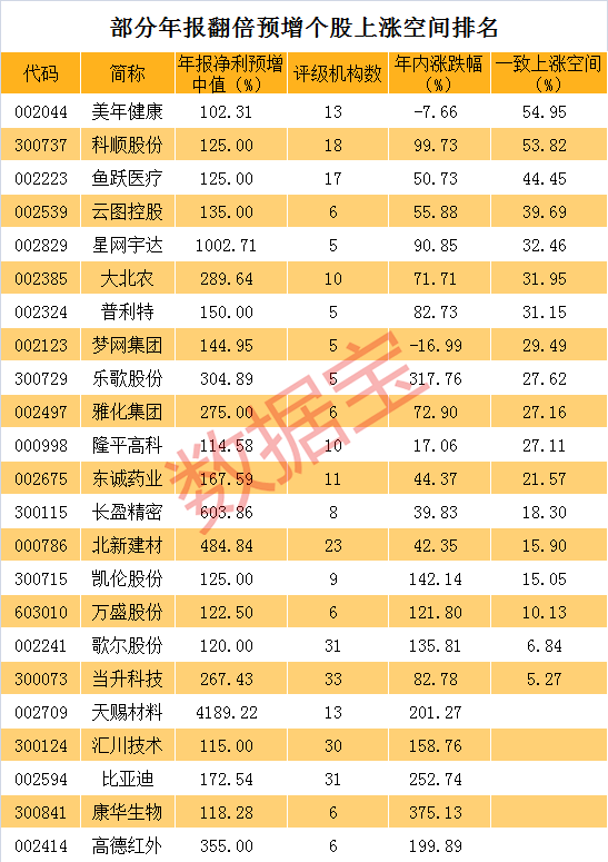 年报业绩暴增股中,还有一批机构高度关注的个股。其中,当升科技、比亚迪、歌尔股份、汇川技术等个股均有30家以上机构评级,北新建材、科顺股份、鱼跃医疗、天赐材料、美年健康等个股均有10家以上机构评级。5家以上机构评级个股中,上涨空间最大的是美年健康,接近55%。此外,科顺股份、鱼跃医疗、云图控股等个股上涨空间均超过30%。