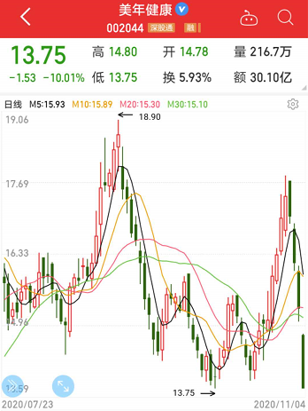 此前已经连续三天大跌的美年健康,今天再度低开低走。截至收盘,该股报收13.75元,收盘跌10.01%,跌停板上封单超过万手。短短的4个交易日,该股累计跌幅超过21%,最新市值超过500亿元。