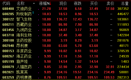 医药板块今日盘中走势强劲,截至收盘,艾迪药业大涨逾21%,羚锐制药、智飞生物、西藏药业、九洲药业、海利生物、吉药控股、昂利康、丰原药业、海正药业、葫芦娃等涨停。
