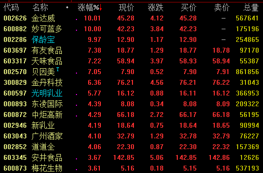 食品饮料板块今日盘中发力走高,截至收盘,金达威、妙可蓝多、保龄宝等涨停,有友食品、天味食品、贝因美等涨幅超7%。
