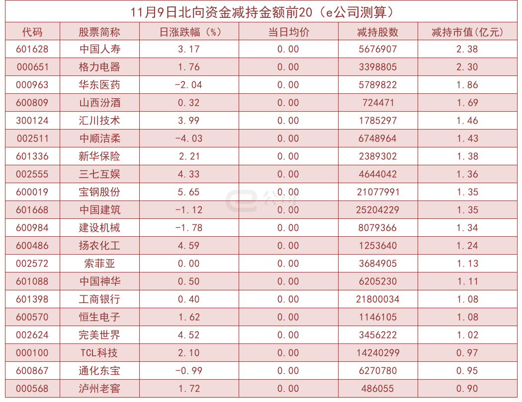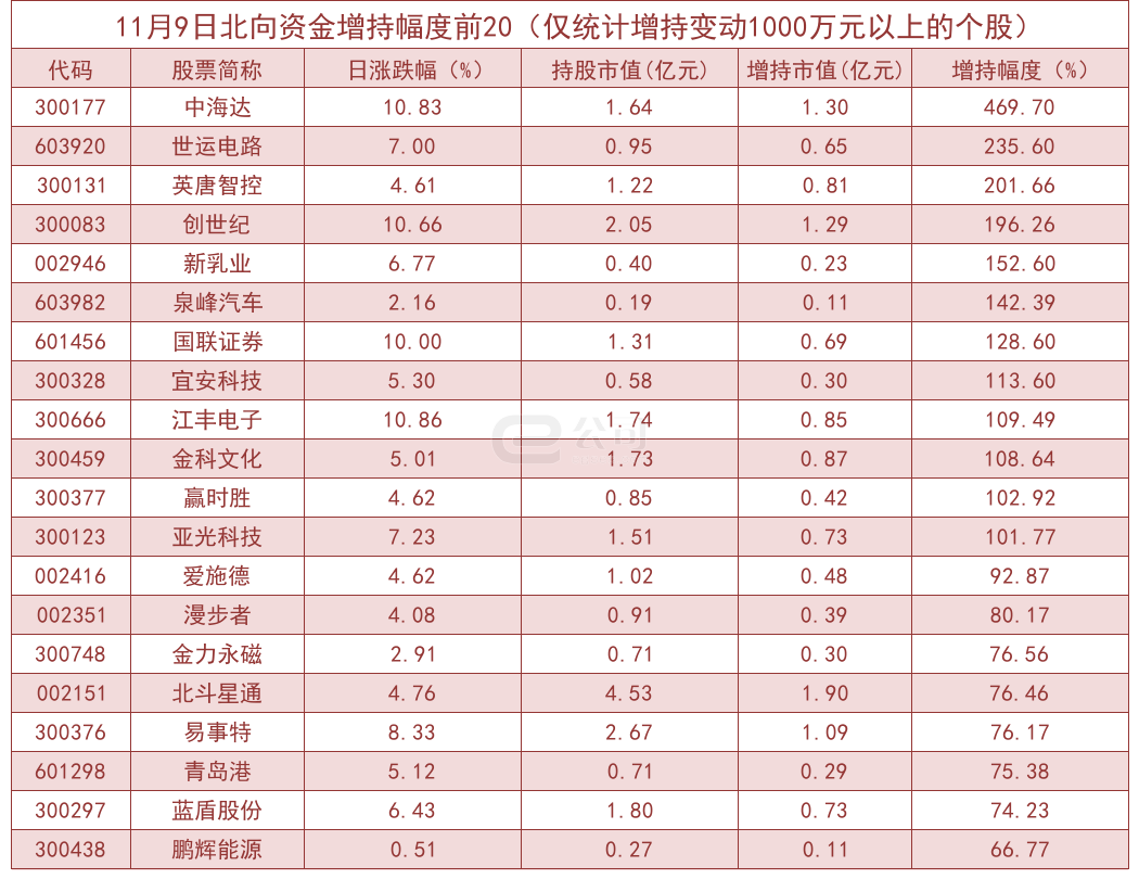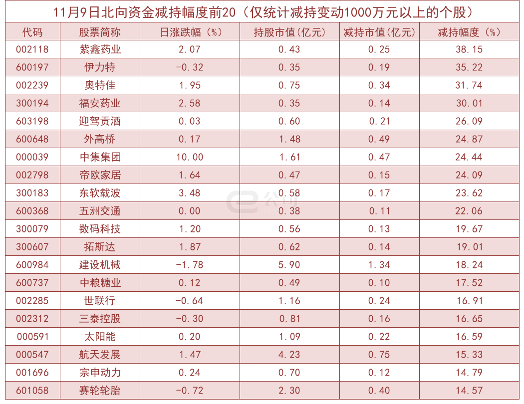 据e公司测算,增减持变动1000万元以上的个股中,中海达、世运电路、英唐智控、创世纪等获北向资金大幅增持,分别为469.70%、235.60%、201.66%、196.26%。而紫鑫药业、伊力特、奥特佳、福安药业等减持幅度较大,分别减持38.15%、35.22%、31.74%、30.01%。