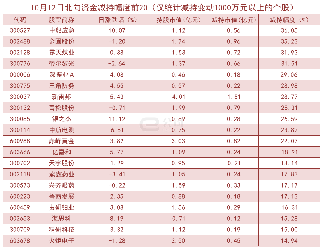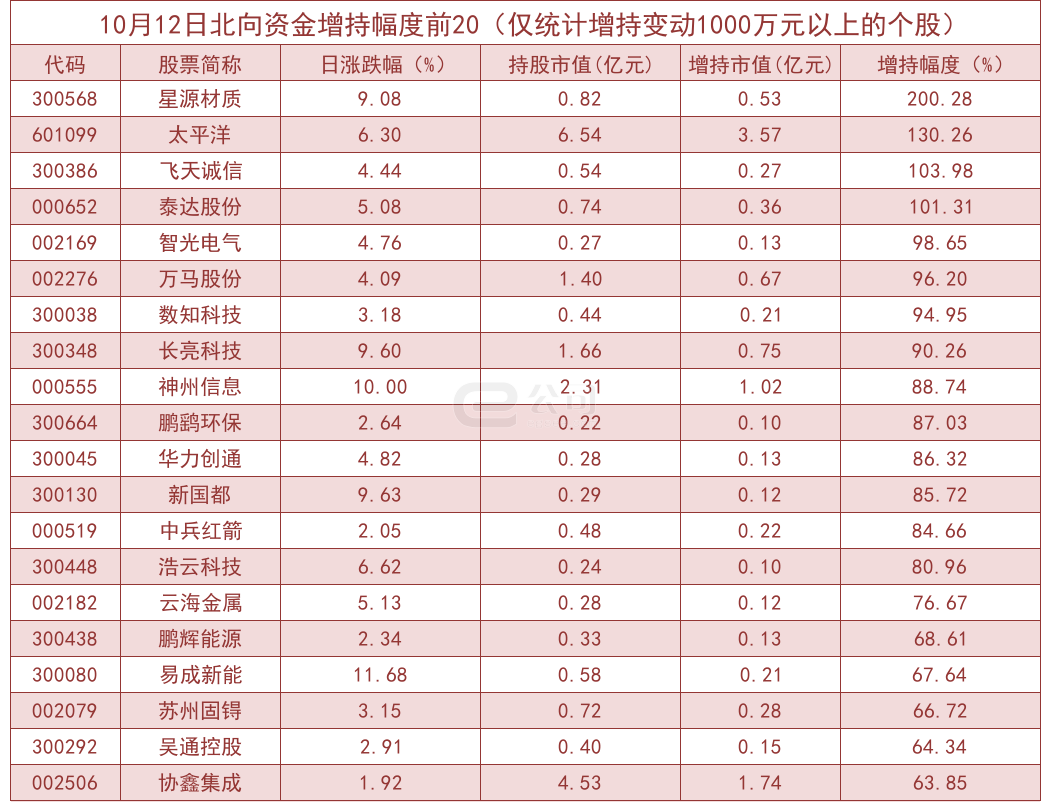 据e公司测算,增减持变动1000万元以上的个股中,星源材质、太平洋、飞天诚信、泰达股份等获北向资金大幅增持,分别为200.28%、130.26%、103.98%、101.31%。而中船应急、金固股份、露天煤业、帝尔激光等减持幅度较大,分别减持36.05%、35.23%、31.93%、31.51%。