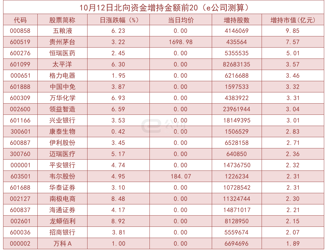 从个股来看,五粮液、贵州茅台、恒瑞医药、太平洋等个股获北向资金增持规模居前,增持市值分别达到9.85亿元、7.57亿元、5.01亿元、3.57亿元。比亚迪、京东方A、TCL科技、海螺水泥等获北向资金减持规模居前,减持市值分别为4.19亿元、2.89亿元、2.59亿元、2.53亿元。另外,包钢股份、宝钢股份、中信证券、中国医药等连续3天获得北向资金增持。