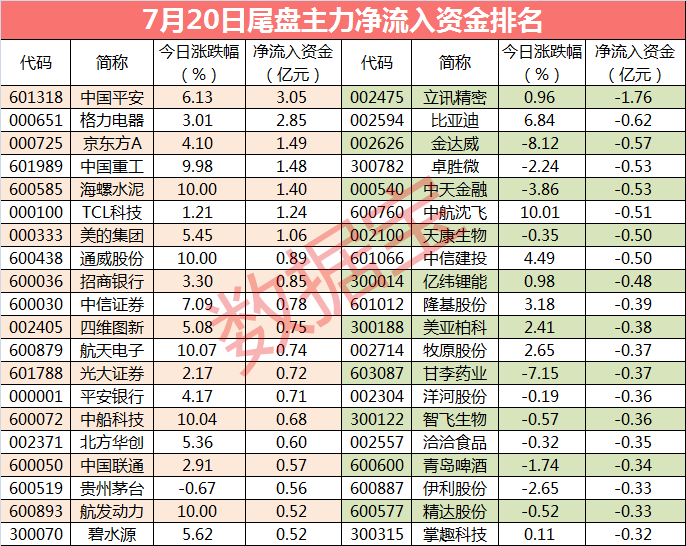从个股尾盘资金流向数据看,有23股尾盘净流入资金超过5000万元,中国平安、格力电器、京东方A等个股尾盘资金净流入金额最多,分别高达3.05亿元、2.85亿元、1.49亿元;立讯精密、比亚迪、金达威等个股尾盘资金净流出金额最多。