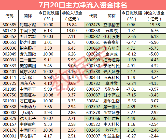 个股来看,共有90只个股主力资金净流入超亿元,两只白马股海螺水泥和中国平安获主力重点关注。海螺水泥主力资金净流入15.84亿元,净流入资金居首;中国平安、浙江龙盛紧随其后,全天净流入资金分别为13亿元、7.11亿元;全天净流入资金较多的还有格力电器、招商银行等。股价表现方面,净流入资金超亿元个股今日平均上涨7.29%,表现强于大盘,涨停的有中国铝业、国海证券、航天电子等。跌幅较大的个股有捷安高科等,跌幅分别为6.68%。