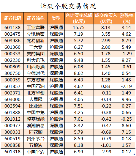 活跃个股方面,北向资金今日净买入较多的有工业富联、立讯精密、兆易创新、三六零、美的集团,净买入金额分别为8.13亿元、3.55亿元、2.99亿元、2.8亿元、1.78亿元。北向资金净卖出较多的有中国平安、五粮液、贵州茅台、同花顺、浪潮信息,净卖出金额分别为2.99亿元、1.01亿元、0.79亿元、0.69亿元、0.47亿元。