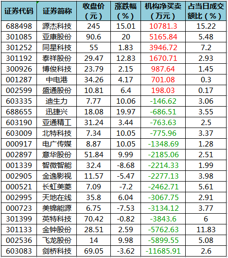 盘后龙虎榜数据显示,今日机构席位资金合计净卖出约2.28亿元。其中,净买入的个股7只,净卖出的个股15只。机构净买入最多的股票是源杰科技,净买入金额约1.08亿元;机构净买入居前的还有亚康股份、同星科技、泰祥股份等股。机构净卖出最多的股票是剑桥科技,净卖出金额约1.17亿元;机构净卖出居前的还有飞龙股份、金钟股份、英特科技等股。