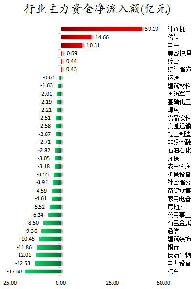 从行业板块来看,申万所属的31个一级行业,今日有6个行业板块主力资金呈现净流入,其中,计算机行业板块主力资金净流入最多,净流入金额为39.19亿元;行业板块主力资金净流入居前的还有传媒、电子,净流入金额分别为14.66亿元、10.31亿元。25个行业板块主力资金呈净流出,其中,汽车行业板块主力资金净流出最多,净流出金额为17.6亿元;行业板块主力资金净流出靠前的还有电力设备、医药生物、银行、建筑装饰、通信,净流出金额分别为12.53亿元、12.01亿元、11.86亿元、10.45亿元、9.36亿元。