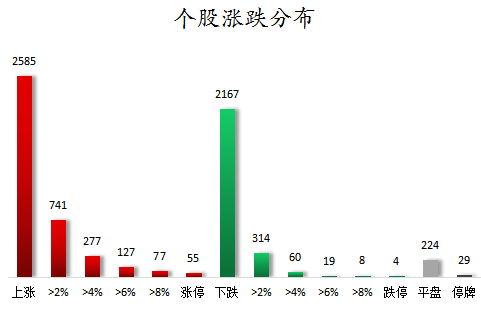 截至收盘,沪深两市合计2585只个股上涨,2167只个股下跌,平盘个股224只,停牌的个股29只。不含当日上市新股,共有55只个股涨停,4只个股跌停。连续涨停天数看,*ST榕泰已连收5个涨停板,连续涨停板数量最多。