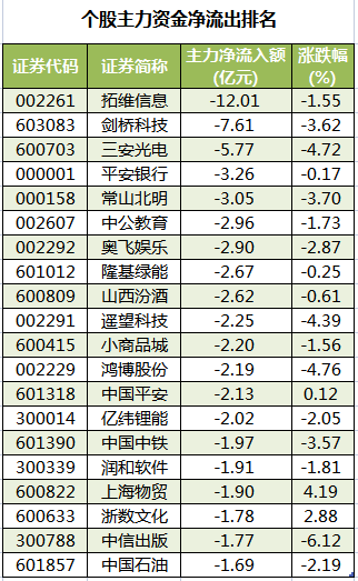 此外,2944只个股被主力资金净卖出,其中,46股被主力资金净卖出超1亿元。主力资金净流出最多的个股是拓维信息,净流出金额为12.01亿元;力资金净流出居前的个股还有剑桥科技、三安光电、平安银行、常山北明、中公教育,净流出金额分别为7.61亿元、5.77亿元、3.26亿元、3.05亿元、2.96亿元。