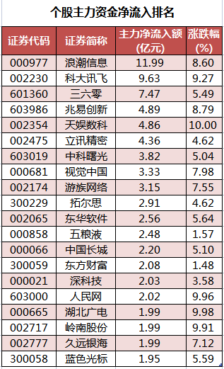 个股来看,今日有2014只个股获主力资金净流入,其中,47股获主力资金净流入超1亿元。浪潮信息获主力资金净流入最多,净流入金额为11.99亿元;主力资金净流入居前的个股还有科大讯飞、三六零、兆易创新、天娱数科、立讯精密,净流入金额分别为9.63亿元、7.47亿元、4.89亿元、4.86亿元、4.36亿元。