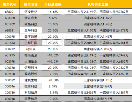 龙虎榜机构榜单上榜个股明显增多,多只信创概念股获机构买卖。其中信安世纪获五家机构买入近1.5亿,星环科技、数字证通均获机构买入超7000万,中科江南获机构买入超5000万。此外,雄帝科技、科创信息、南天信息三只信创概念股则遭机构卖出。