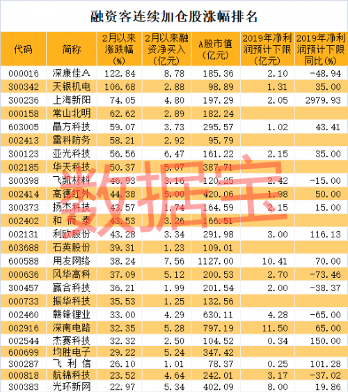 从春节以来融资客整体加仓情况来看,有81股获融资客连续每周加仓且累计净买入超亿元。累计净买入额最高的是深康佳A,累计净买入8.78亿元。深康佳A周五再度涨停,最新收盘价创四年来新高,2月以来该股累计涨幅达到122.84%。
