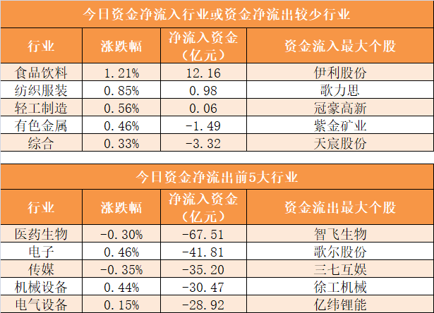 28个申万一级行业中,3个行业实现资金净流入,其中食品饮料行业净流入12.16亿元居首。