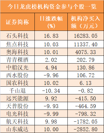 盘后龙虎榜数据显示,机构现身13股,其中石头科技等7股呈现机构资金净买入,山东威达等6股呈现机构资金净卖出。