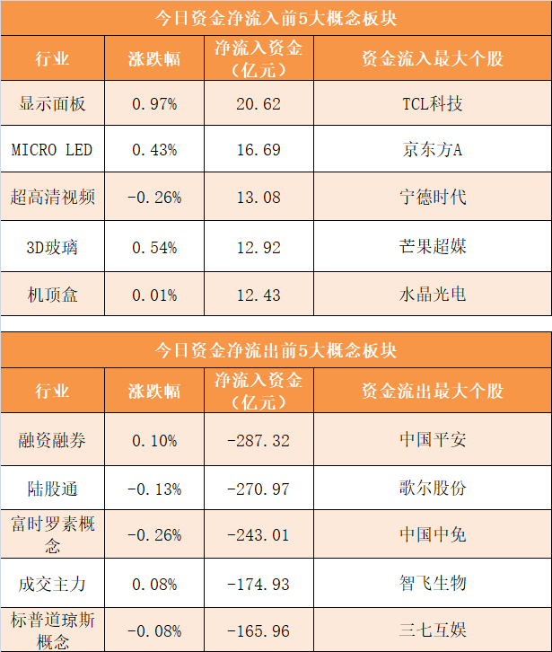 概念板块方面,今日显示面板、MICRO LED、超高清视频、3D玻璃等概念板块资金呈现净流入,其中显示面板概念净流入20.62亿元居首。