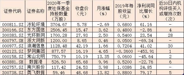 表:2020年一季度社保基金持仓的数据中心概念股