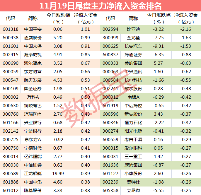 从个股尾盘资金流向数据看,有8股尾盘净流入资金超过5000万元,中国平安、通威股份、中国太保等个股尾盘资金净流入金额最多,分别高达1.01亿元、0.99亿元、0.91亿元;比亚迪、金龙鱼、长安汽车等个股尾盘资金净流出金额最多。