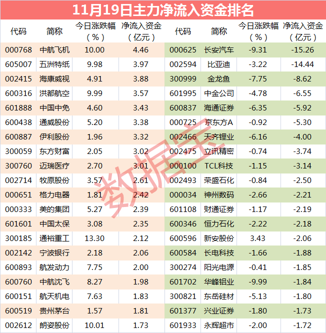 个股来看,共有38只个股主力资金净流入超亿元,中航飞机主力资金净流入4.46亿元,净流入资金居首;五洲特纸、海康威视紧随其后,全天净流入资金分别为3.97亿元、3.88亿元;全天净流入资金较多的还有洪都航空、中国中免等。股价表现方面,净流入资金超亿元个股今日平均上涨6.07%,表现强于大盘,涨停的有朗姿股份、长方集团等个股。