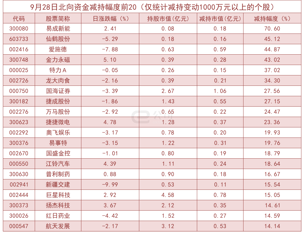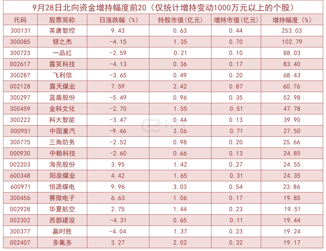 据e公司测算,增减持变动1000万元以上的个股中,英唐智控、银之杰、一品红、露笑科技等获北向资金大幅增持,分别为253.03%、102.79%、88.03%、83.40%。而易成新能、仙鹤股份、爱施德、金力永磁等减持幅度较大,分别减持70.60%、45.12%、44.87%、43.02%。