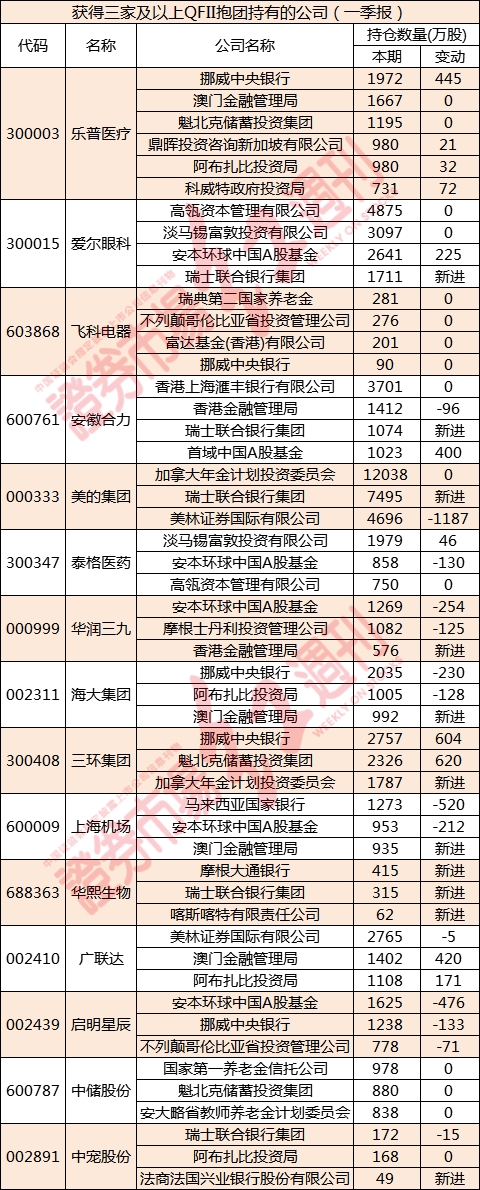 此外,QFII抱团程度较高的还有爱尔眼科、飞科电器和安徽合力,这3家公司前十大流通股东中同时出现四家QFII身影。