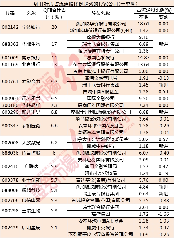 从持股比例角度看,一季度QFII持股占流通股比例超过5%的公司有17家,且持股比例居前的公司有宁波银行(20%)、华熙生物(17%)、南京银行(14%)等。