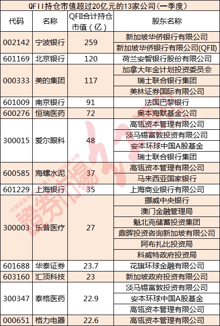 从持仓市值角度看,一季度QFII持仓市值超过10亿的公司有22家,持仓市值超过20亿的公司有13家,持仓市值超过100亿的公司仅有3家。