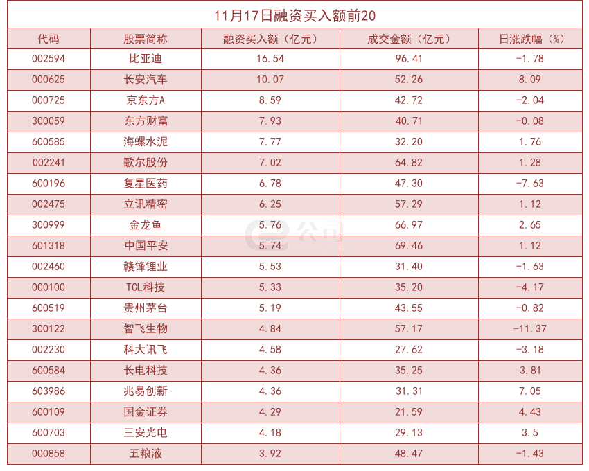 从融资资金买入金额来看,共有142只个股买入金额超亿元,其中比亚迪(16.54亿元)、长安汽车(10.07亿元)、京东方A(8.59亿元)居前三位。