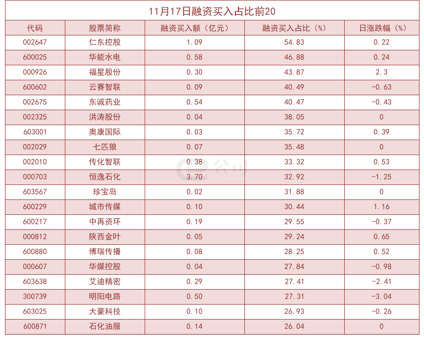 个股方面,沪深两市共有1840只个股有融资资金买入。从融资买入额占当日总成交金额比重来看,共有107只股票融资买入额占比超20%,其中仁东控股(54.83%)、华能水电(46.88%)、福星股份(43.87%)排名前三。