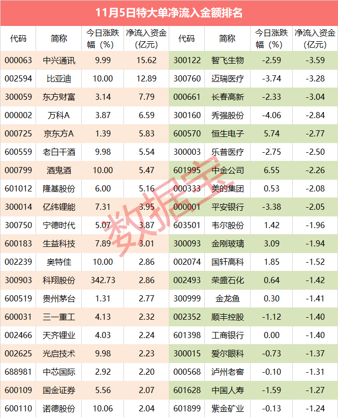 今日有3只个股特大单净流出超3亿元,智飞生物全天特大单净流出3.59亿元居首。紧随其后是迈瑞医疗和长春高新,全天特大单净流出分别为3.28亿元和3.04亿元。