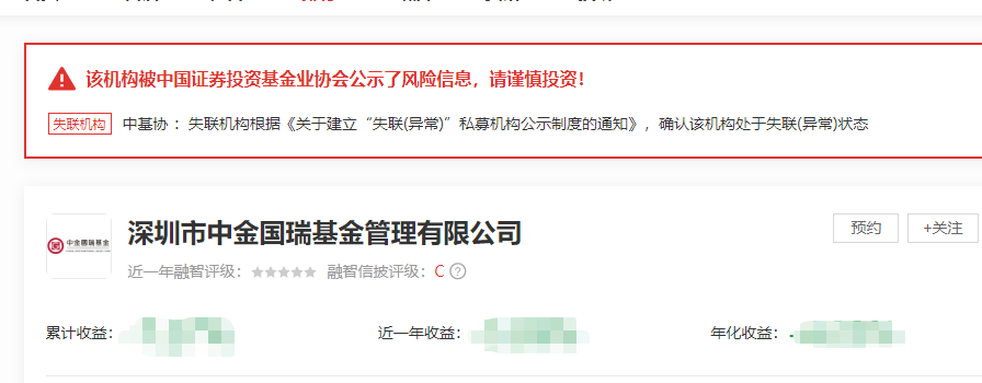 在私募排排网搜索中金国瑞会显示,“该机构被中国证券投资基金业协会公示了风险信息,请谨慎投资!”的醒目提示。